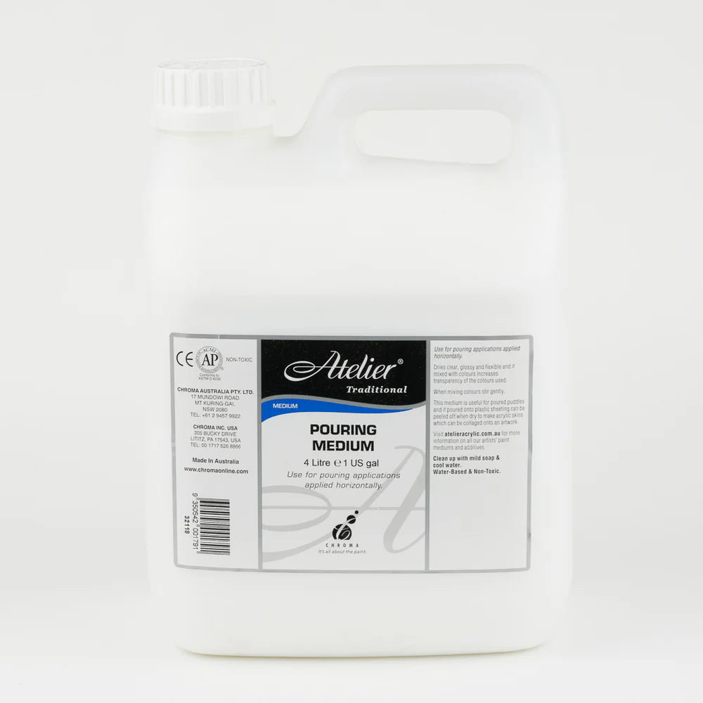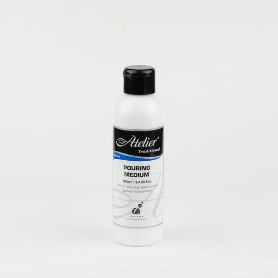 Simply mix with Atelier Interactive, Free Flow or any artist acrylic paint and pour onto a flat surface. The medium thins the paint so it pours easily and forms smooth even puddles with no air bubbles. Increases colour transparency enhancing paint layering effects and dries to a beautiful gloss finish.