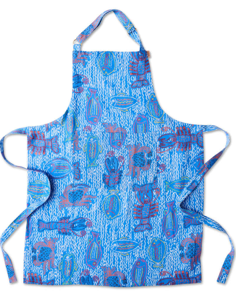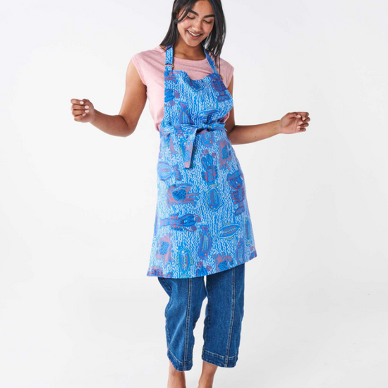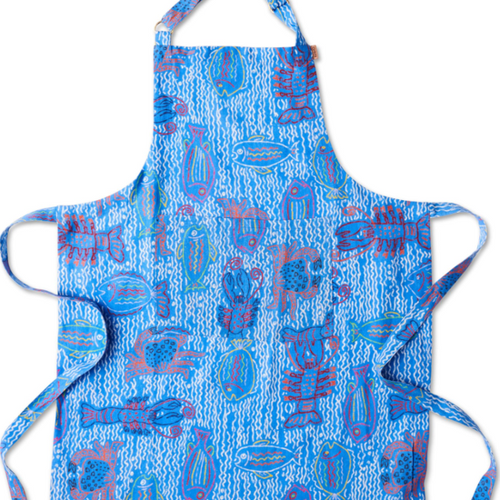 Look the part when cooking up your favourite feasts with our stylish and handy French flax linen aprons. Keep those clothes clean with The Deep Blue Linen Apron, featuring illustrated underwater creatures on a blue base.