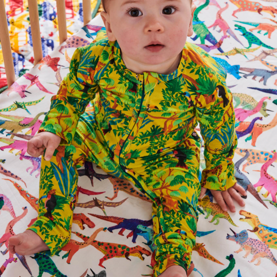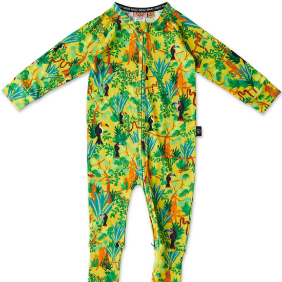 Keep it simple with the Jungle Boogie Organic Long Sleeve Zip Romper featuring some of your favourite jungle friends swinging from the treetops and slithering through the canopy in a palette of chartreuse and blue green with pops of orange. Our much loved zippy baby rompers are an everyday staple for daytime adventures and sleep time snoozing. Made from snuggly soft organic cotton jersey free from nasty chemicals, pollutants and irritants, our rompers are a safe, healthy and planet friendly choice. We want the very best for our babies.