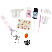 - Each set includes: 1x mini bubble tea cup and lid, iridescent pink vinyl hand strap w/key ring hardware, 1x mini sticker sheet, 1x mini straw, 1x strawberry charm, mini ‘boba’ balls, mixing tool, mixing tray, pink & clear Magic Glue (for mixing)