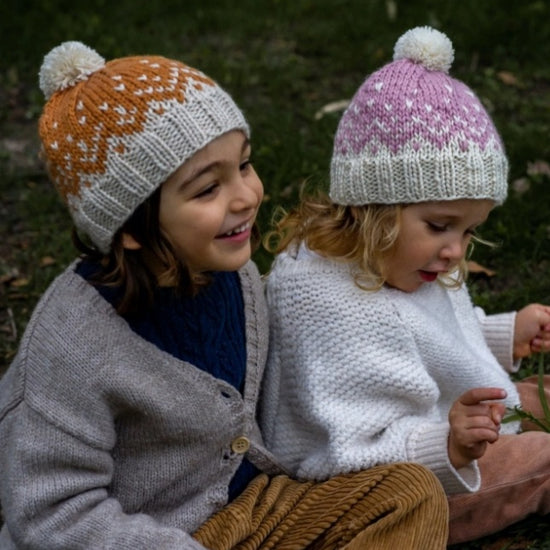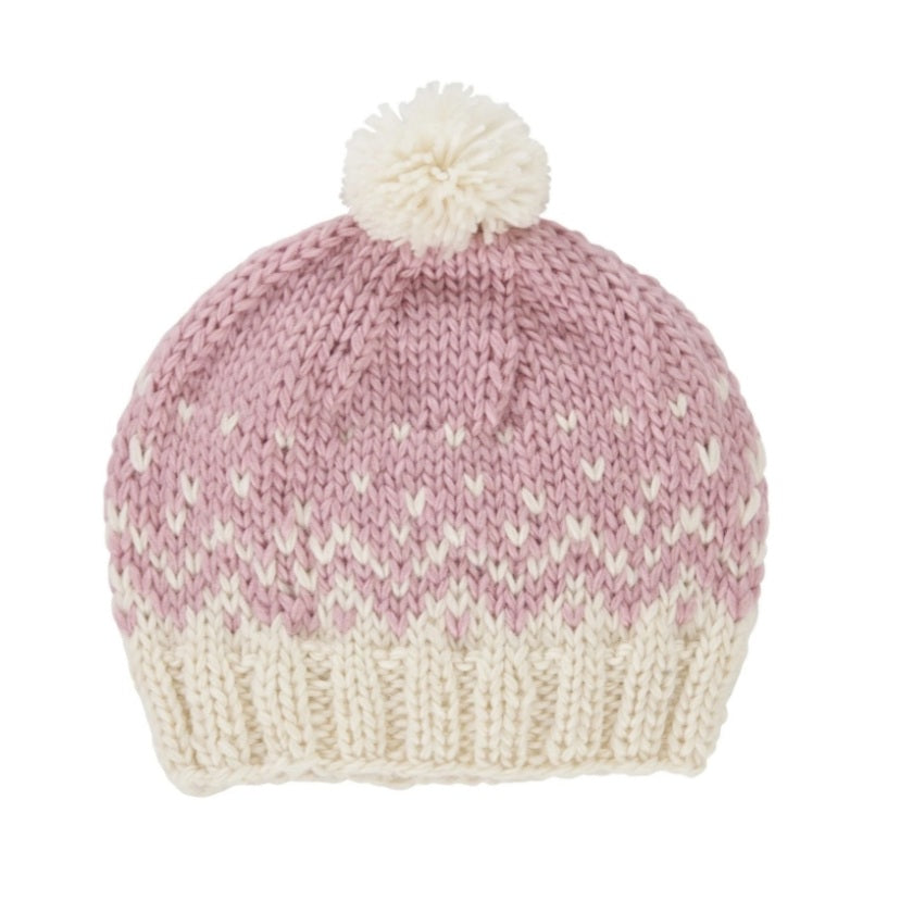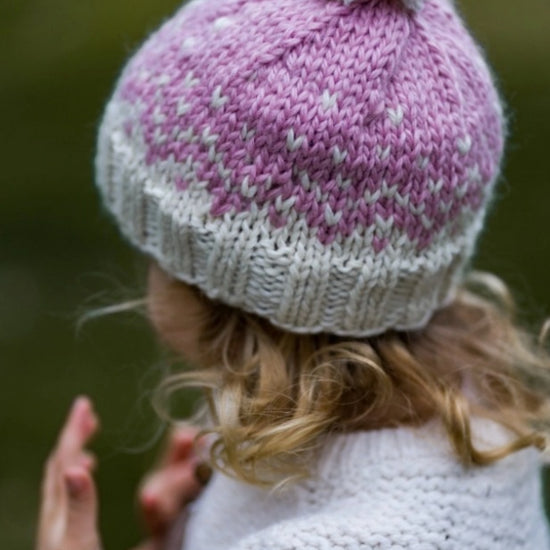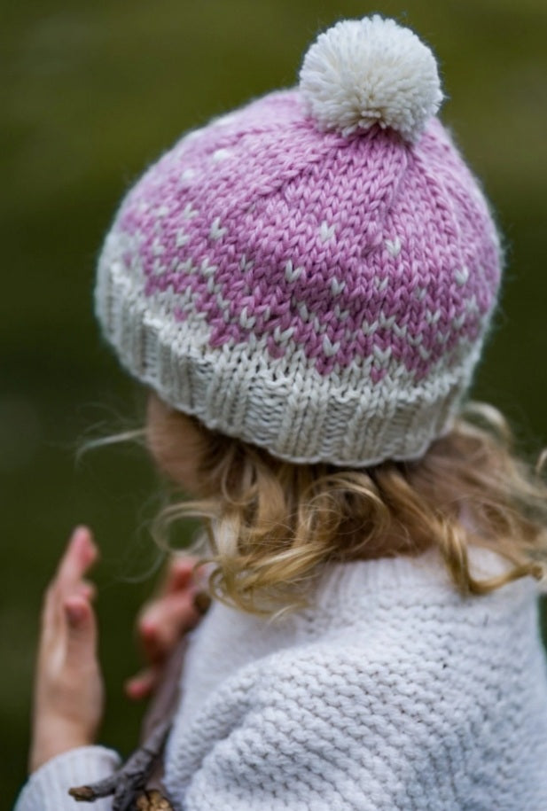 Hand knitted beanie with 2x2 ribbing around the face, cute snowflake design and a pom pom on top.