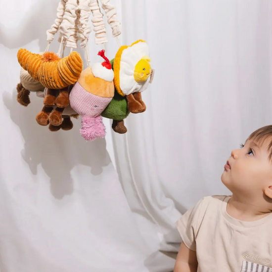 Keep your little one entertained when out and about with our gorgeous Mini Market Brunch stroller toys. Our Avocado & Egg on Toast is made from polyester plush and features a soft rattle to enhance the play experience. They attach easily to any stroller/pram hood, bumper bar, or even baby's play-gym or car seat.