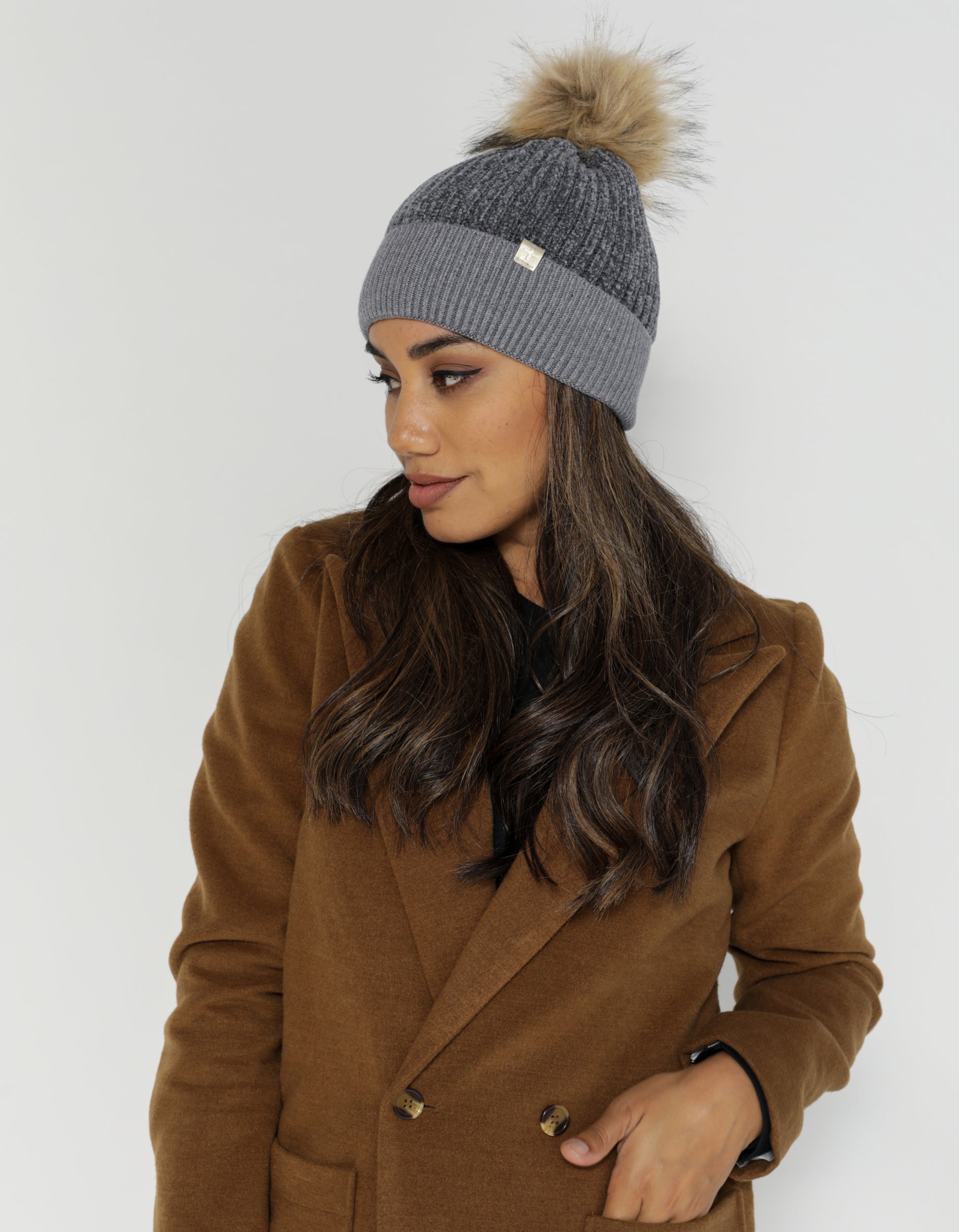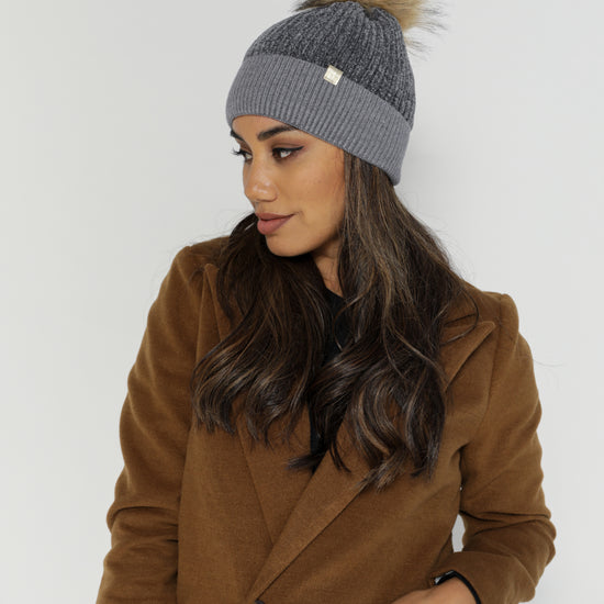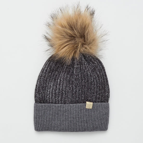 Chenille Beanie with Pom Pom - Grey