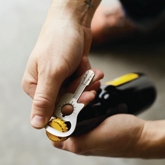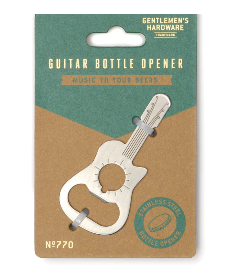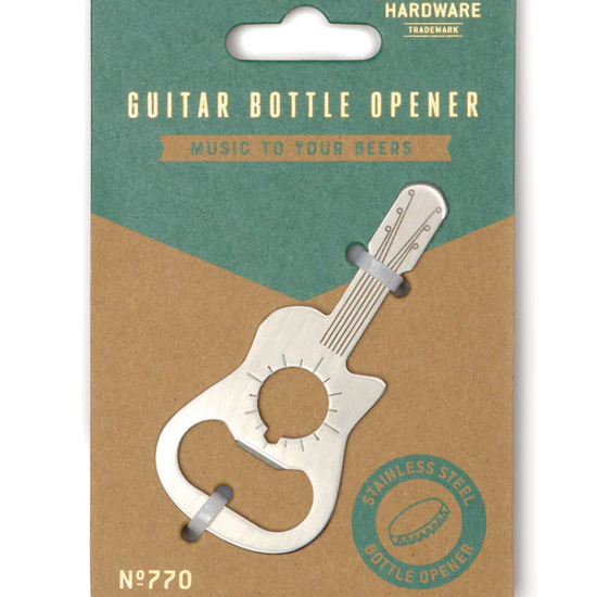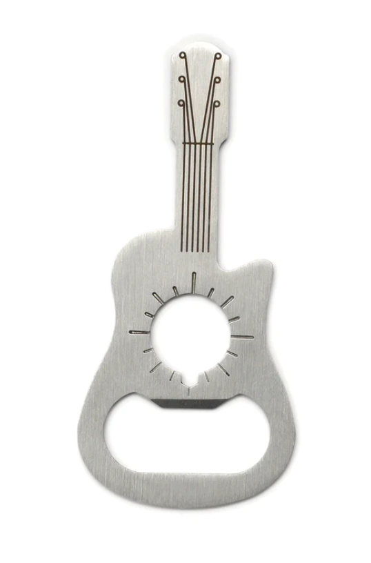 This guitar bottle opener is sure to strike a chord with any music and drink enthusiast! Fashioned from stainless steel in the shape of an acoustic guitar, this handy tool can be used to open capped bottles with ease. Includes direction ancillary indication for an added survival tool bonus!